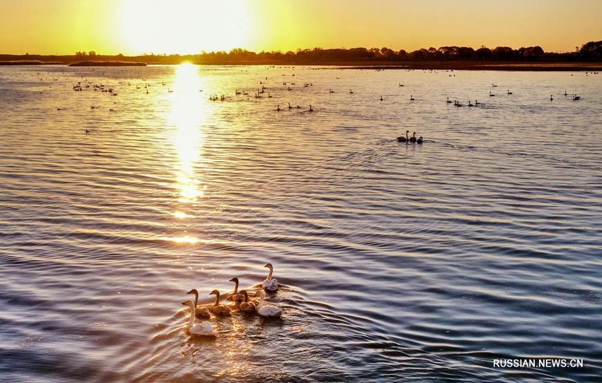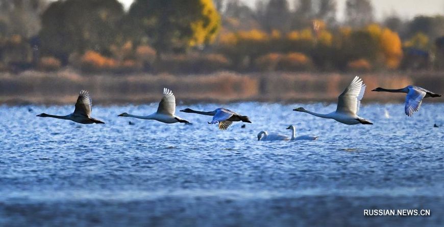 3 ноября, Шэньси /БЕЛТА - Синьхуа/. На водно-болотные угодья водохранилища Хэкоу в районе Юйян провинции Шэньси (северо-запад Китая), в эти дни прилетают стаи белых лебедей, красных уток и других птиц. Это идеальное место для перелетных птиц, которые могут здесь сделать остановку и подкрепиться на пути к месту зимовки.-0-