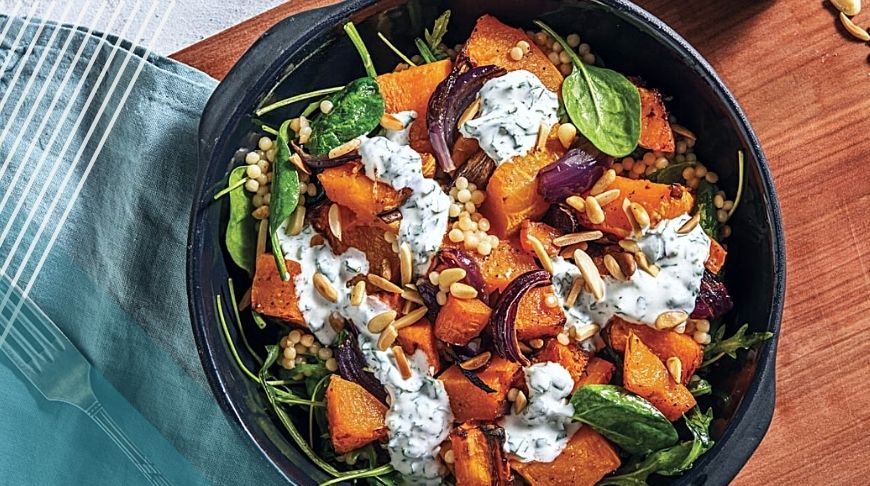 Перекус. Салат с кус-кусом, печеной тыквой, шпинатом и фетой