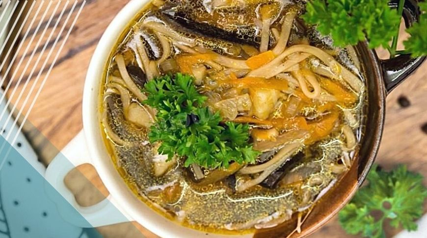 В кастрюлю с бульоном добавьте грибы и жидкость, в которой они настаивались.