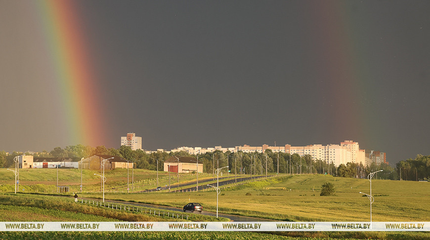 19 июня, Минск /Корр. БЕЛТА/. Радуга раскрасила небо над Минском, Витебском и Гродно после теплого летнего дождя. На смену солнечной и теплой погоде, как часто бывает летом, пришла прохлада и дождь. Жители городов, спеша укрыться от осадков, успели заметить на фоне хмурого закатного неба радугу. Согласно народным приметам, вечерняя радуга предвещает хорошую погоду.
