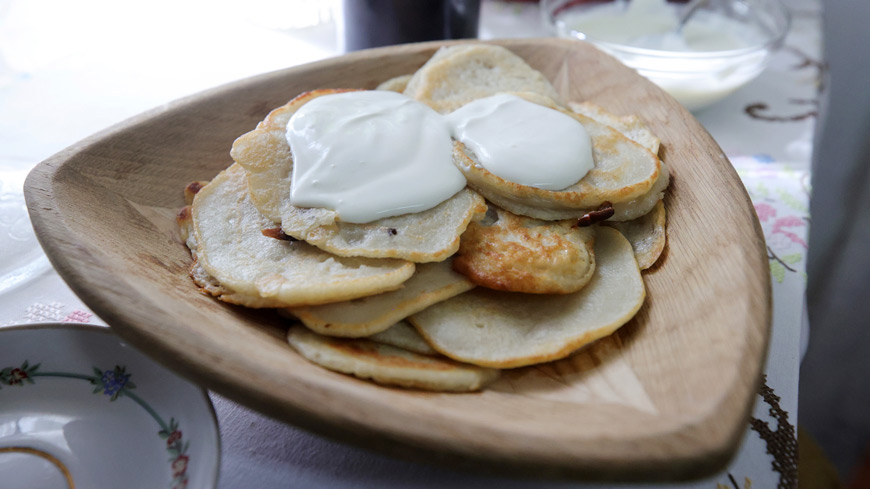 - Съешь пару горячих оладий со сметаной и сыт чуть ли не на весь день, - говорит хозяйка.