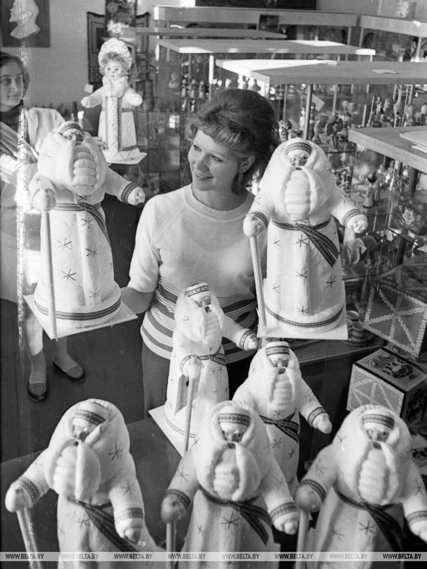 26 декабря 1977 года. Брестская фабрика сувениров. Работница фабрики Раиса Тихон с Дедами Морозами. Фото Эдуарда Кобяка.