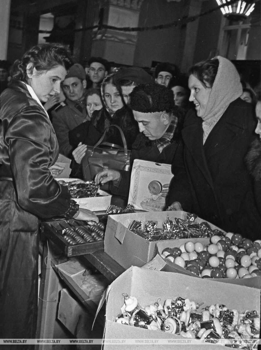 27 декабря 1957 года. Продажа елочных игрушек к Новому году в минском ГУМе. Фото Владимира Лупейко.