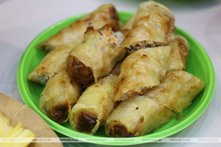- Пирог начиняют бобами, клейким рисом и свининой, нарезанной на мелкие кусочки. Для придания формы используется специальный деревянный квадрат. Готовится баньчынг на живом огне на дровах. Надежно завернутый и перевязанный пирог укладывают в большой котел с водой, накрывают крышкой и хорошенько ее придавливают поленом, чтобы держать внутри пар, - поясняет через переводчицу Чрезвычайный и Полномочный Посол Социалистической Республики Вьетнам в Республике Беларусь Нгуен Ван Нгы. - Кушанье варится от 12 до 24 часов в зависимости от размера пирога.