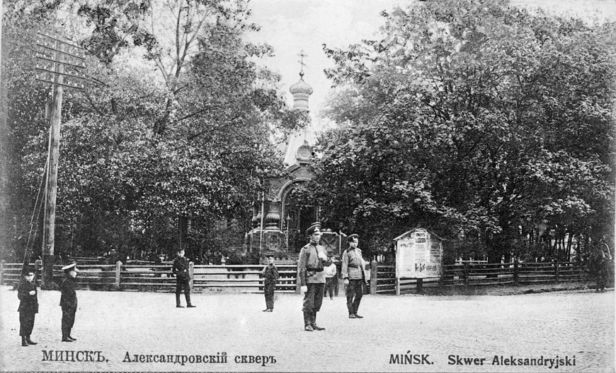 При входе в Александровский сквер на углу улиц Захарьевская и Доминиканская - современных проспекта Независимости и улицы Энгельса - в мае 1869 года была построена часовня во имя святого благоверного Александра Невского