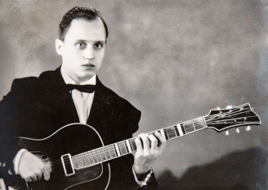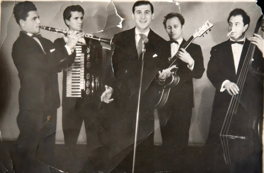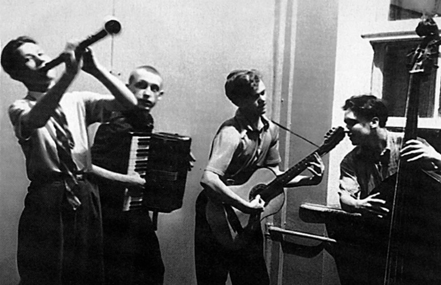 На снимках тех лет мы видим Георгия Арсеньевича, отца музыканта, вальяжного, с гитарой и папиросой. А вот и шестнадцатилетний Володя с контрабасом и его задорный джаз-квартет "Клюшка, бубен и утюг". Собирались ребята в клубе имени Сталина. На гитаре играл другой парень - возможно, Леня Завадский, который вспоминал: "Партию контрабаса Вовка разрабатывал для себя сам, хотя для остальных музыкантов руководитель писал партитуры". Остальные инструменты - аккордеон и кларнет.