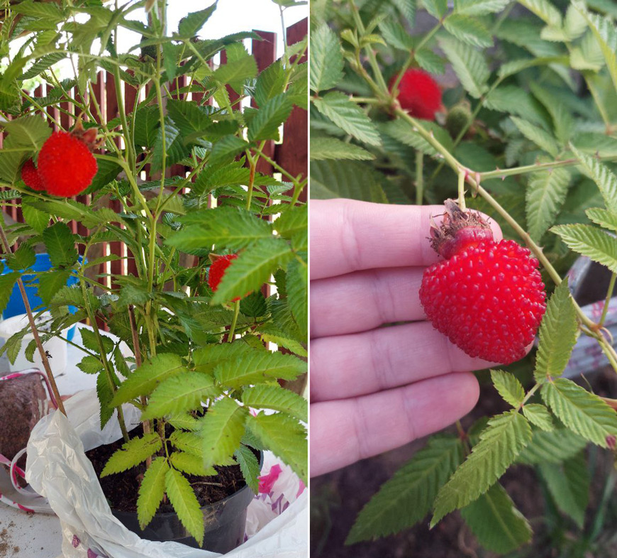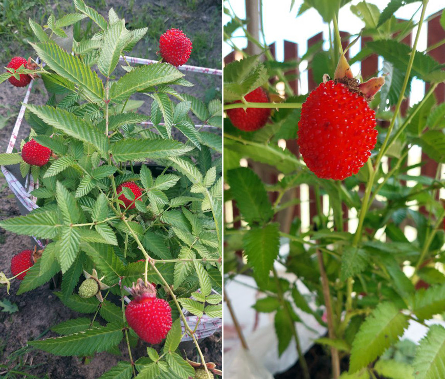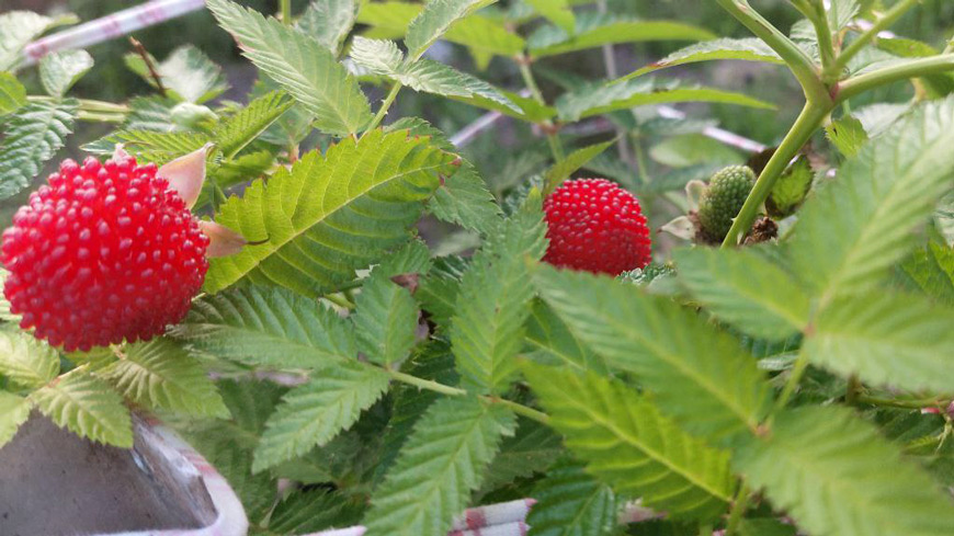 Как оказалось, названий у этого растения множество: тибетская, соблазнительная или розолистная малина, ежеклубника, малиника, малино-клубника. Многие ошибочно считают ее гибридом двух ягод - земляники и малины. На самом же деле это облагороженный сорт дикой малины из Японии. В природе он растет в высоту до трех метров, а одомашненный вид - до 60-70 сантиметров. Стебли с листьями колючие, поэтому, когда сразу несколько кустов растут друг возле друга, собирать ягоды и проводить уходовые процедуры лучше всего в прочных перчатках, закрывая одеждой открытые участки тела (руки, ноги). Разрастется этот экзот достаточно быстро, так что, уж поверьте, недостатка с посадочным материалом не будет. Листья сочного ярко-зеленого цвета по форме тоньше, чем у привычной нам малины, а ягоды - крупные, полые внутри, на вкус - кисло-сладкие, держатся на плодоножке.