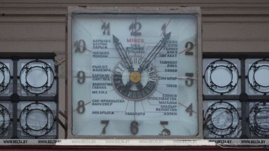 По словам Александра Лабецкого, главные часы почтамта не раз обновлялись. Сейчас это электронно-механическое устройство, работающее от привода двигателя, которым управляет часовая станция. Главная задача этих часов - показывать точное время Минска, которое видно на большом внешнем циферблате. Но есть и второй, внутренний циферблат. Он вращается в противоположную сторону и разделен на белую и черную половины. Это нужно, чтобы показывать, где сейчас день, а где ночь в 35 разных городах мира - от Анкориджа до Сиднея. Раньше городов было 50, но из-за перехода на летнее время возникла неразбериха, и пару лет назад циферблат заменили, сократив количество стран.