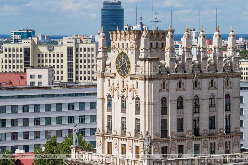 Когда вы прибываете в Минск, первое, что бросается в глаза на Привокзальной площади, - башни-близнецы, которые называют "воротами Минска". Их создал архитектор Борис Рубаненко, возвели в 1953 году. "Ворота" словно приглашают окунуться в столичную атмосферу. На одной башне красуется герб БССР, а на другой - величественные часы: минутная стрелка длиной более полутора метров, а весь механизм весит три с половиной тонны! Говорят, это самые большие башенные часы в Беларуси. Раньше они отбивали время, а управлялись огромными шестеренками и гирей, трос от которой спускался по шахте лифта аж до шестого этажа.