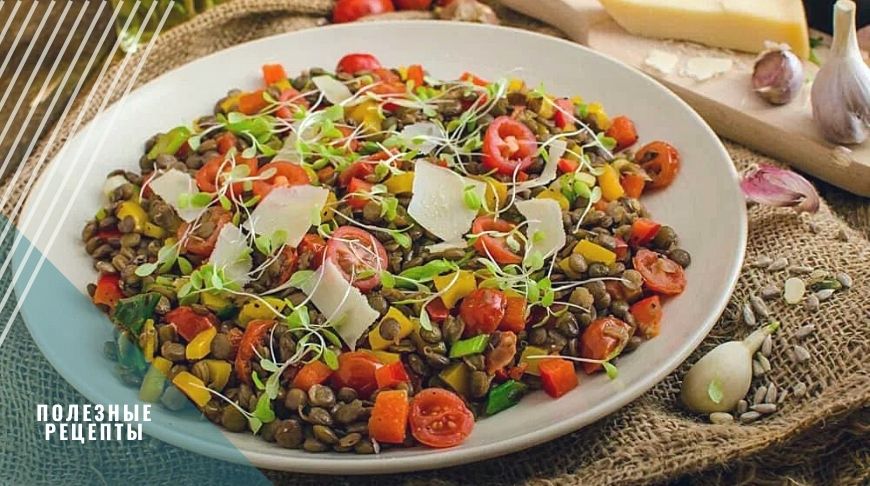 Добавьте в сковороду с морковью и луком чечевицу, зелень, орехи и заправку, перемешайте. Дайте всему настояться 10 минут, чтобы чечевица впитала заправку.