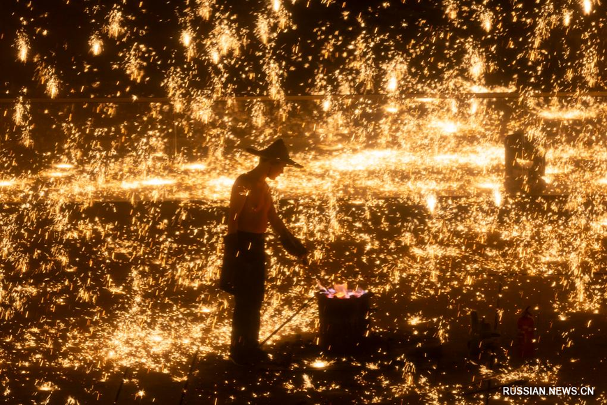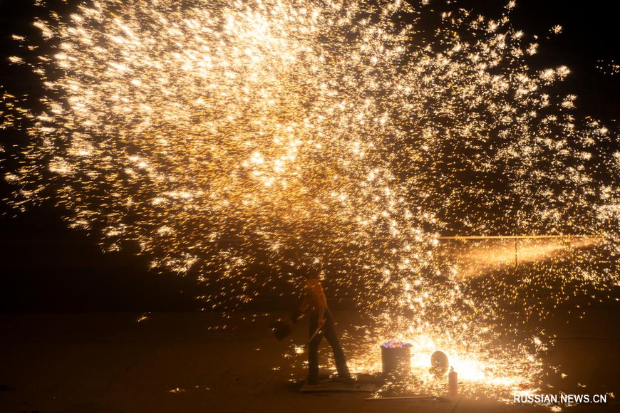 9 февраля, Минск /БЕЛТА - СИНЬХУА/. В рамках фестиваля культуры Праздника весны (Чуньцзе, традиционный китайский Новый год по лунному календарю) на берегу реки в городе Шанхай на днях состоялось необычное "шоу фейерверков" из расплавленного чугуна. Такую альтернативу фейерверку придумали в древности кузнецы: когда жидкий чугун достигает 1600 градусов, его подкидывают в воздух с помощью дощечек, в результате чего образуется "дождь из железных цветов".-0-