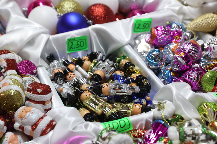 В Минске одной из первых локаций по продаже новогодних товаров стал Комаровский рынок. Живой ели пока в продаже нет, зато на выбор огромное количество искусственных красавиц - как говорится, на любой вкус и кошелек. Цены начинаются от 40 рублей. Ряды с украшениями заманчиво блестят и переливаются огоньками гирлянд. Маленькие пластиковые елочные шарики диаметром 2-3 сантиметра здесь предлагают всего за 50 копеек, стеклянные расписные - от 6 рублей за штуку.