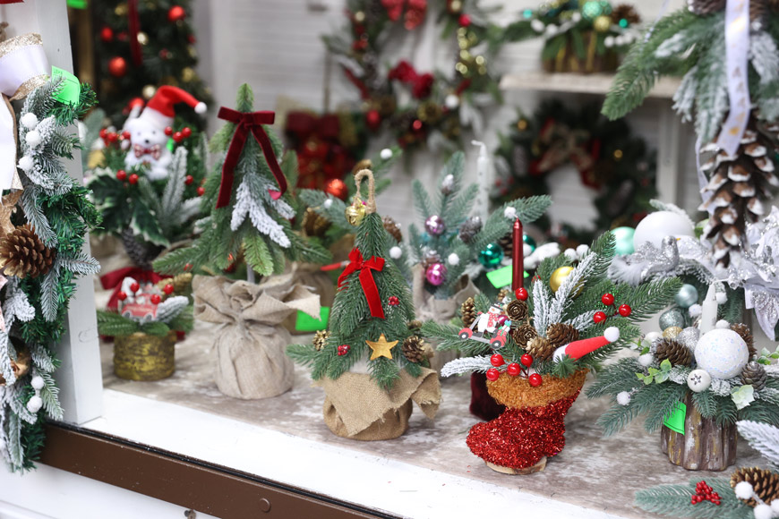 больших искусственных елок, усыпанных инеем и шишками, до игрушек разных цветов