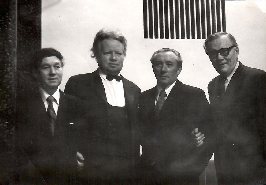 Генадзь Цітовіч з Міхасём Дрынеўскім і артыстамі Дзяржаўнага народнага хору БССР. Канец 1970-х