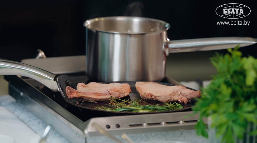 Свинину мы будем готовить методом су-вид, что в переводе с французского означает "в вакууме". При этой технике продукты запечатывают в герметичные вакуумные пакеты и затем готовят при низких температурах на водяной бане. В нашем случае это 2,5-3 часа при 80 градусах. Такой способ позволяет добиться идеальной текстуры и раскрыть все вкусовые нюансы продукта.Кароль Гуттен-Чапский был новатором: при его руководстве в Минске построили Купаловский театр, пивоваренный завод и телефонную станцию - настоящие открытия для города! А первый телефон в Минске появился в отеле "Европа". Это наша вторая вкусная тайна.