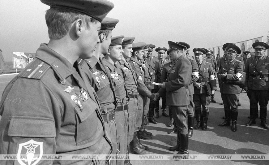 11 сентября 1981 года. Учения войск и сил флота "Запад-81". Командующий воздушно-десантными войсками генерал-полковник Д.Сухоруков вручает от имени Министра обороны СССР именные часы отличившимся воинам. Фото В.Витченко, Н.Малышева.