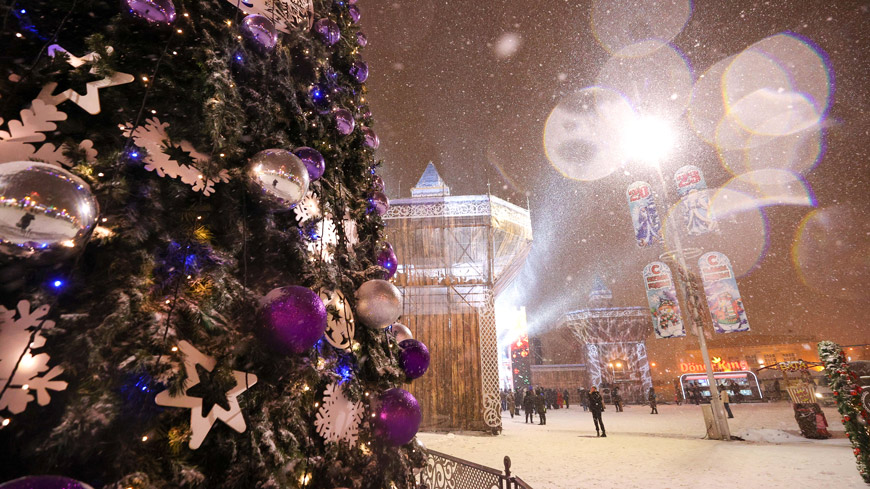 Стартуем с главной елки страны. Она окружена световым фонтаном - выглядит необычно, а внутри можно и побегать, и наснимать красивых фото. Имеется и Дед Мороз, с которым тоже не помешает сделать пару кадров. На остальной площади раскинулся сказочный городок, в котором предлагают поживиться чем-нибудь лакомым для настроения.