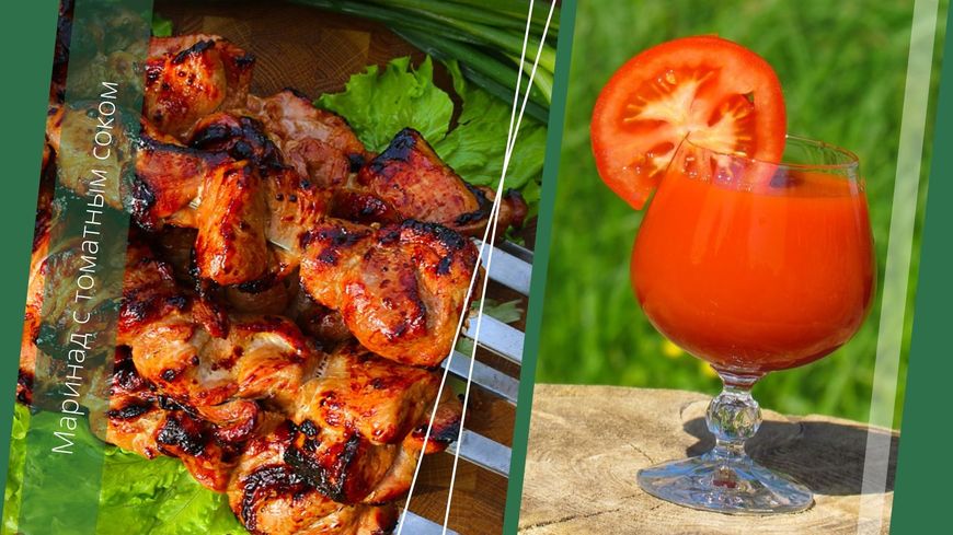 Томатный сок (выбирайте в магазине именно сок, а не нектар) соедините с соевым соусом. Добавьте соль, сахар и перец. Выдавите в маринад чеснок, положите кольца лука и мясо. Оставьте на 3-4 часа.