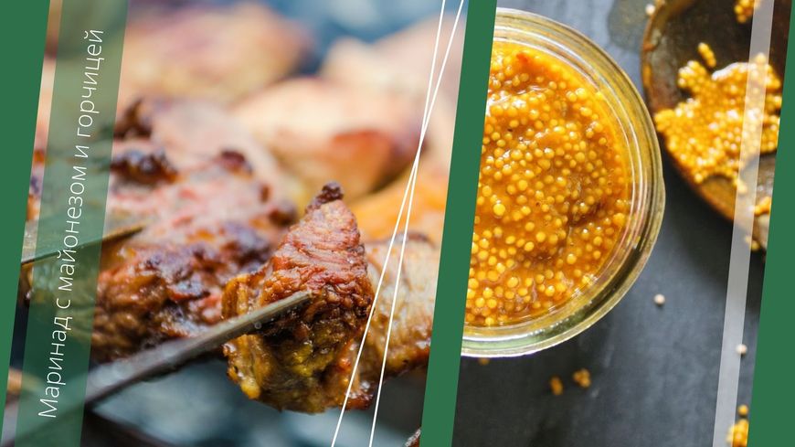 Соедините майонез с горчицей двух видов и посолите по вкусу. Добавьте кольца лука. Мясо нарежьте на порционные куски и поместите в маринад на ночь. Утром шашлык будет полностью готов к приготовлению.