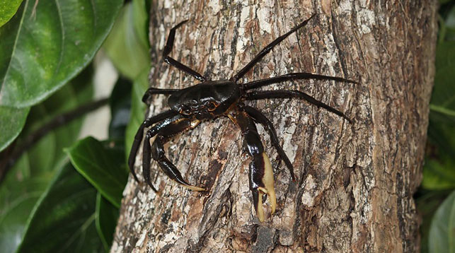 Впервые краб, ползающий по дереву, как паук, был замечен в 2014 году местными жителями. Затем исследователи занялись его поисками и изучением. Согласно описанию специалистов, у древесных крабов-пауков широкое иссиня-черное туловище, размером чуть меньше человеческой ладони. Ноги этих существ оснащены загнутыми "коготками", помогающими карабкаться вверх по стволу.
