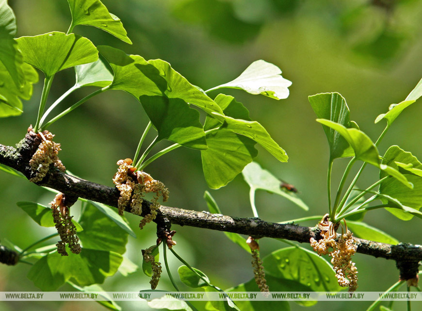 18 мая 2010 года. Первое цветение мужского дерева гинкго билоба двулопастного в гомельском парке. Оно посажено в 1960-е годы взамен погибших в годы Великой Отечественной войны уникальных реликтовых деревьев, высаженных еще князьями Паскевичами.