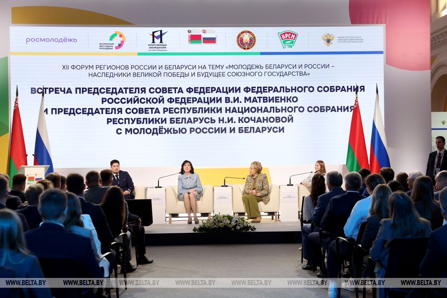 Председатель Совета Федерации Валентина Матвиенко и председатель Совета Республики Наталья Кочанова на полях XII Форума регионов Беларуси и России в Нижнем Новгороде проводят встречу с представителями молодежи России и Беларуси. "Не хочу говорить банальные вещи, что в ваших руках будущее страны, и это на самом деле так. Но мне кажется, что вот это наша единая ДНК цивилизационная, наша общая духовность - это самое главное, что нас объединяет. Да, конечно, и экономическое, и инвестиционное сотрудничество. Но это наше родство. И очень важно это передавать молодежи и укоренять это в сознании молодежи, - сказала Валентина Матвиенко. - Поэтому мы и решили очень важный форум межрегионального сотрудничества, в котором участвуют практически уже все субъекты Российской Федерации и все области Беларуси посвятить именно молодежи. В этом зале такие молодые, красивые, улыбчивые, энергичные лица. И это - лучшая характеристика молодежи наших стран".