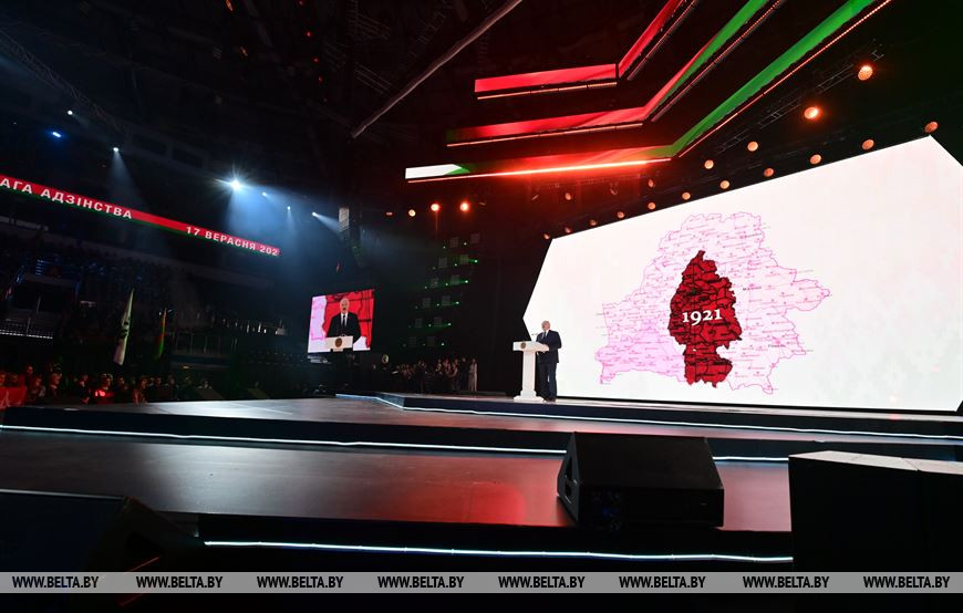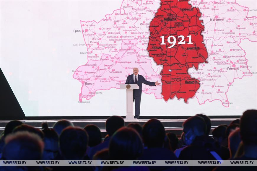 "Мы, белорусы, знаем, что значит в угоду чужим национальным интересам, чьим-то непомерным геополитическим амбициям потерять половину родной земли, утратить связь с близкими и друзьями на долгие 20 лет", - заявил Президент. По его словам, в течение этих нескольких десятилетий свыше 4 млн человек, проживавших на оккупированной Польшей территории, были лишены права говорить на родном языке, учиться в национальных школах, развивать свою самобытную культуру, да и просто зваться белорусами.