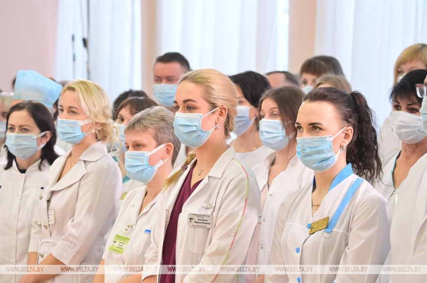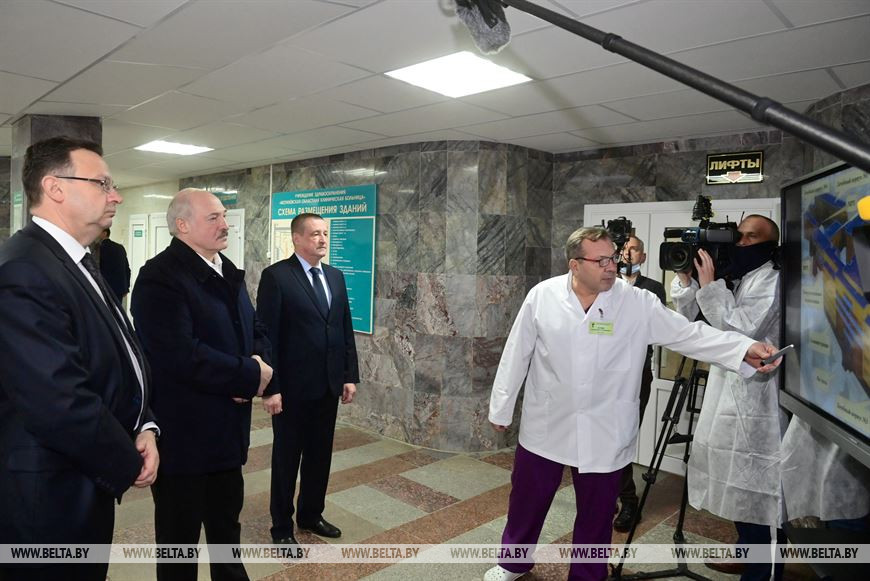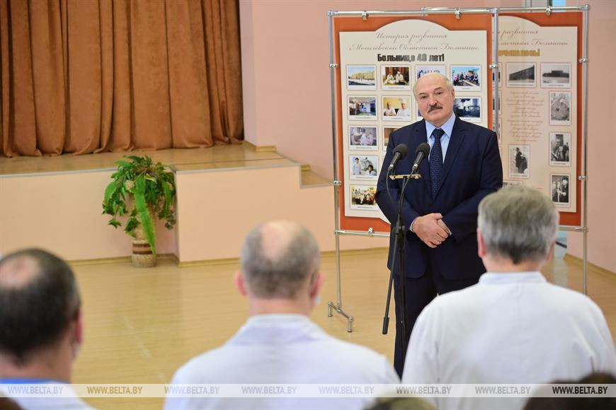 15 декабря, Могилев /Корр. БЕЛТА/. Президент Беларуси Александр Лукашенко поблагодарил медиков в регионах страны в лице коллектива Могилевской областной клинической больницы за спокойную работу в период пандемии, передает корреспондент БЕЛТА.