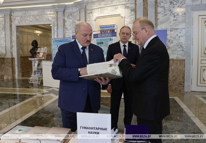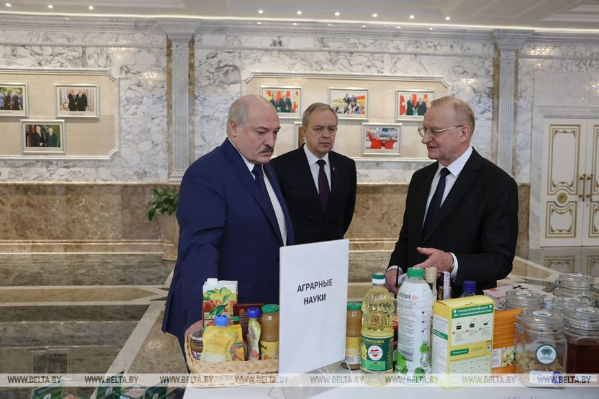 Перед началом мероприятия Александр Лукашенко осмотрел выставку во Дворце Независимости, посвященную научным достижениям в различных областях знаний, в том числе лауреатов государственных премий Беларуси.