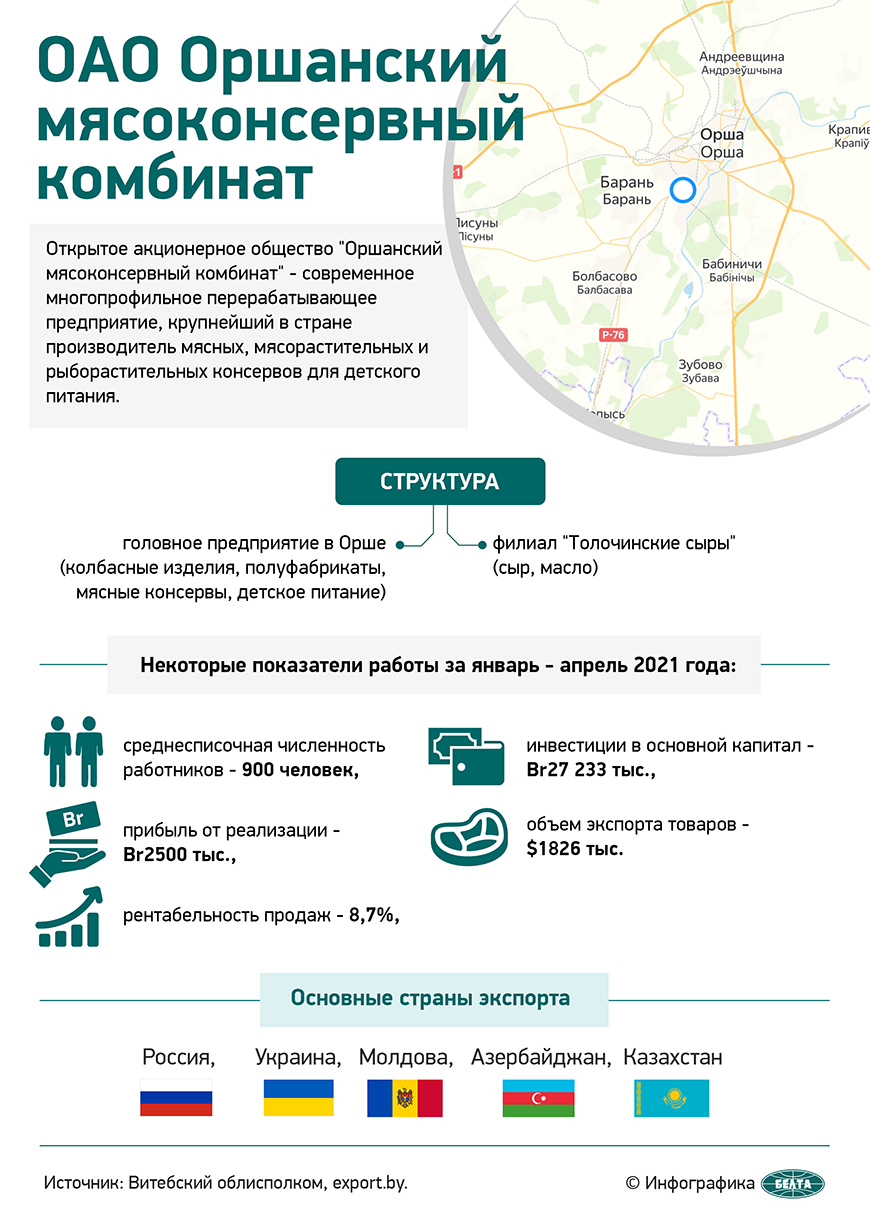 Оршанский мясокомбинат специализируется на производстве колбасных изделий, полуфабрикатов, мясных консервов, в том числе для детского питания - всего более 450 наименований видов продукции. На предприятии работают 765 человек. Кроме того, в состав агропромышленного объединения входит филиал "Толочинские сыры", на производстве которого заняты 135 человек.-0