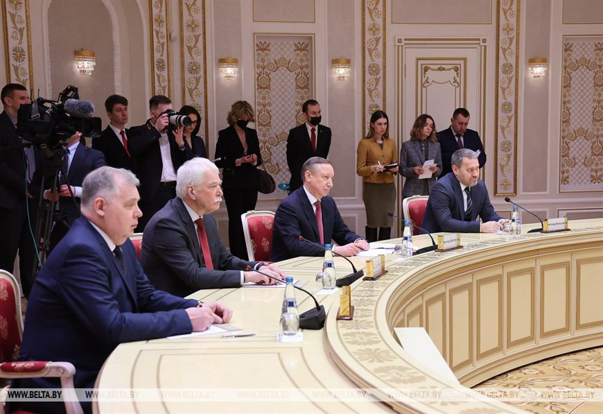 "Очень приятно, что все наши хорошие, добрые друзья, склонные к тесному сотрудничеству наших двух стран, присутствуют за этим столом (кроме губернатора Санкт-Петербурга и членов делегации на мероприятии также присутствовали государственный секретарь Союзного государства Дмитрий Мезенцев и прибывший в Беларусь новый посол России в Беларуси Борис Грызлов. - Прим. БЕЛТА)", - приветствовал делегацию из российской Северной столицы глава белорусского государства.