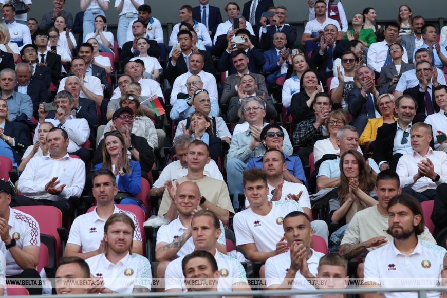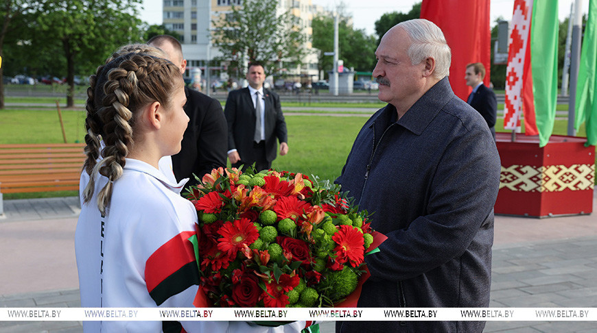 Главу государства у входа на стадион встречали ответственные должностные лица и девушки-спортсменки, которые по сложившейся традиции передали Президенту букет цветов. Первый вопрос, который Александр Лукашенко адресовал присутствующим: "Будем побеждать? Когда?"