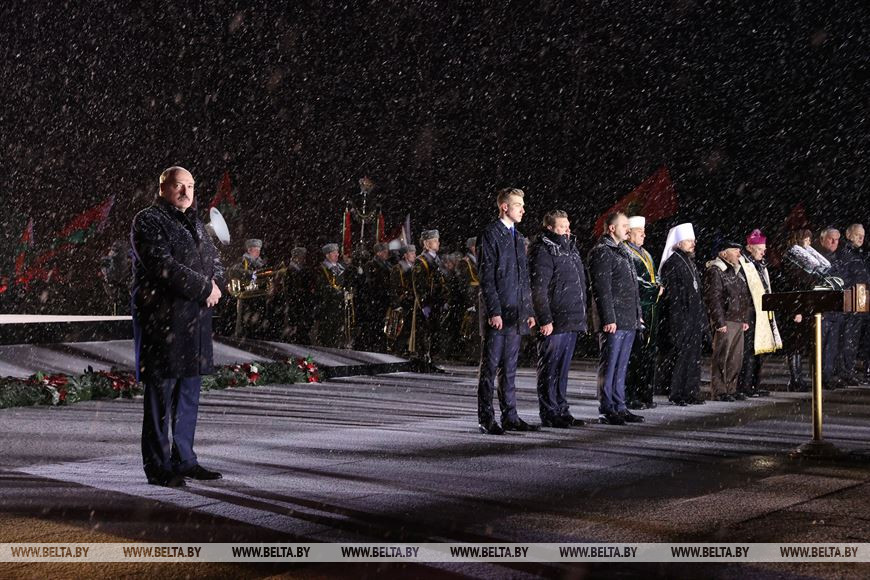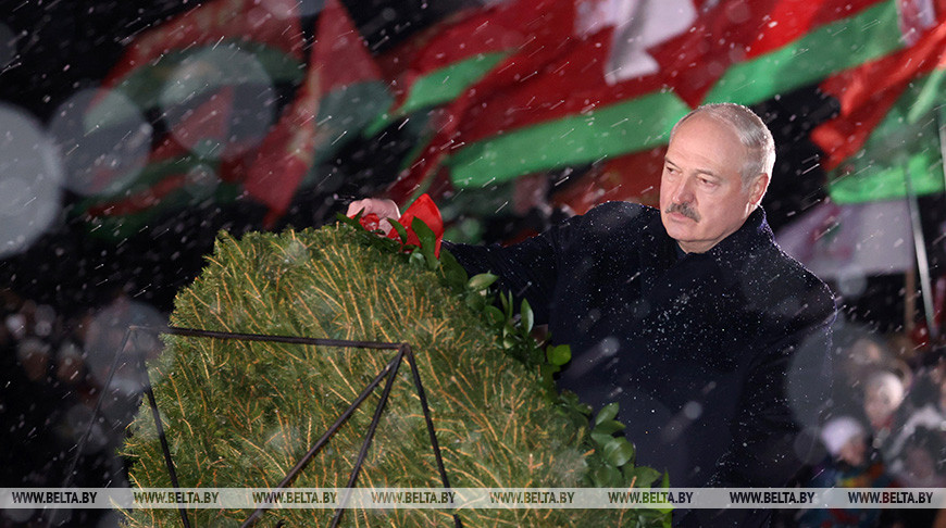 Сначала Президент возложил цветы к памятнику Непокоренному человеку. После просмотра литературно-музыкальной композиции состоялась церемония возложения цветов к Вечному огню.
