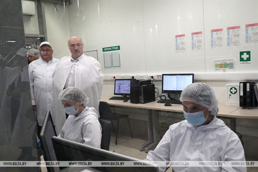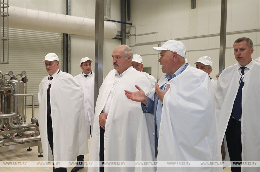 Александр Лукашенко посетил перерабатывающие цеха, ознакомился с технологическим процессом, финансово-экономическими показателями деятельности предприятия.