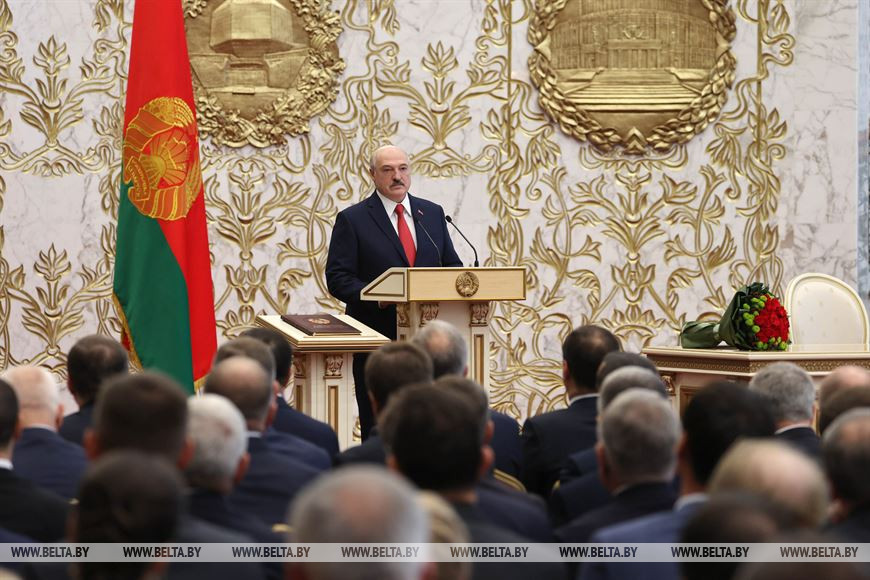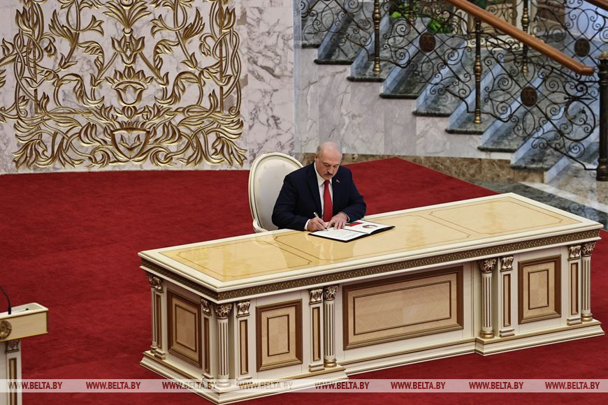 Положив правую руку на Конституцию, Александр Лукашенко произнес присягу на белорусском языке. Затем он подписал акт о принесении присяги, после чего председатель Центральной комиссии Беларуси по выборам и проведению республиканских референдумов Лидия Ермошина вручила Александру Лукашенко удостоверение Президента Республики Беларусь.