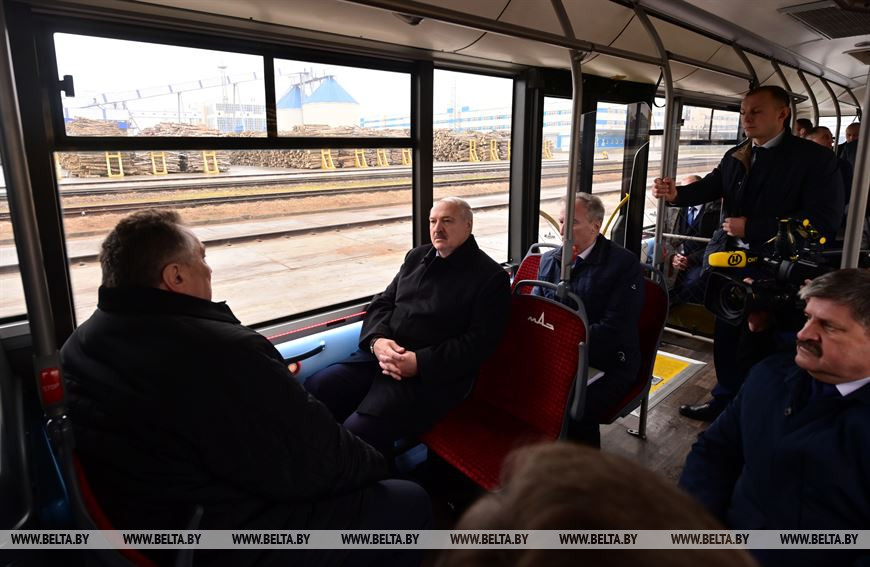 Александр Лукашенко проехал по территории предприятия на электробусе МАЗ и ознакомился с принципами работы основного технологического оборудования по производству картона. Затем глава государства встретился с коллективом фабрики.
