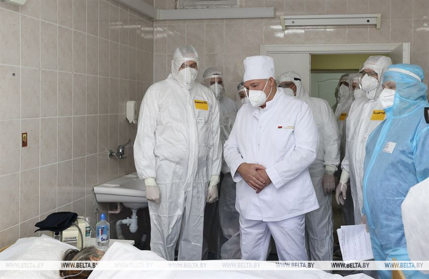 Александр Лукашенко поинтересовался, как развивается ситуация в целом по Гродненской области и ознакомился с порядком оказания медпомощи пациентам с COVID-19 в перепрофилированных отделениях лидской больницы.