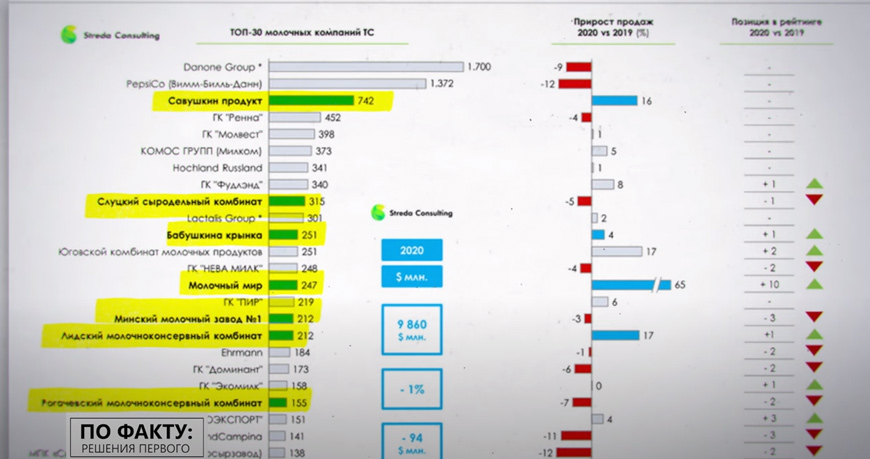 Возвращаясь к началу статьи. Помните, мы говорили, что Беларусь сделала ставку на создание крупнотоварных производств? Аналитики консалтинговой компании Streda Consulting отмечают, что республика за счет консолидации молочных заводов смогла создать крупных игроков на постсоветском пространстве. Совокупная выручка топ-20 молочных компаний Беларуси в 2020 году превысила $3 млрд и в рублях выросла на 22%.