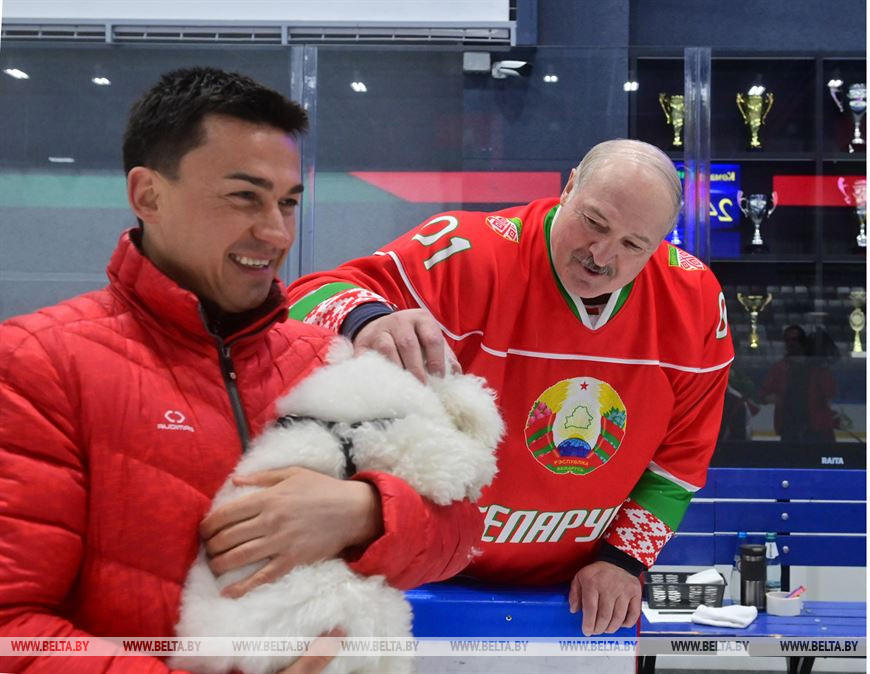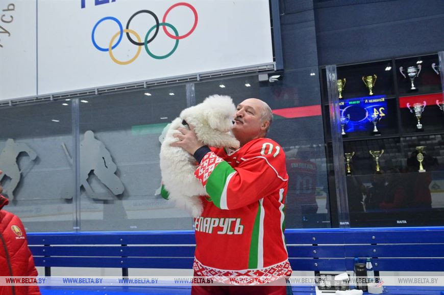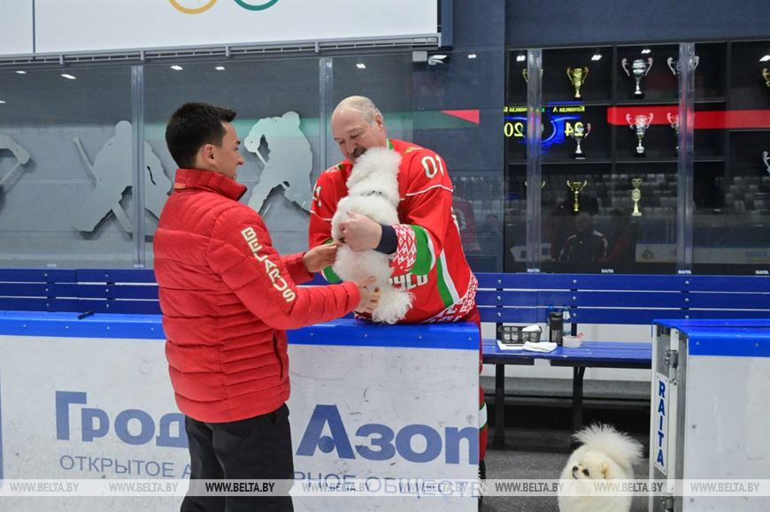 Хозяйка подписала отказ от собаки. Щенка привезли в Минск, и 2 мая в финале хоккейной тренировки Президент подарил ее тренеру своей команды, сенатору Дмитрию Баскову.