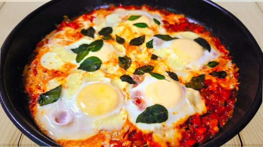Аккуратно разбиваем яйца в сковороду и посыпаем их сыром моцарелла. Украшаем блюдо свежими листиками базилика. Накрываем сковороду крышкой и готовим яичницу на слабом огне около десяти минут. После этого снимаем с огня и подаем к столу. Ваш вкусный и питательный завтрак готов!