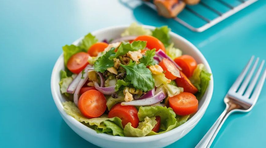 Третий салат – легкий и ароматный, с основой из разноцветных помидоров, нарезанного чили, кинзы, мяты и укропа. Для заправки используют сок лайма, соевый соус, черный перец и растительное масло. В салат добавляют грецкие орехи для текстуры и насыщенности.