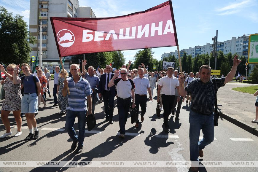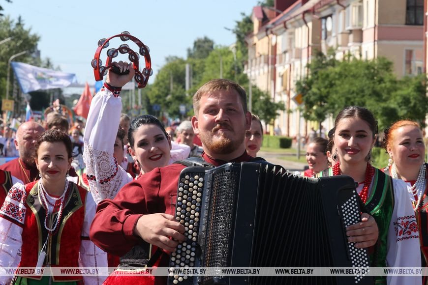 Сегодня в городе идет второй, основной фестивальный день, одним из ярких моментов которого стало праздничное шествие. По центральным улицам города прошли участники и творческие коллективы фестиваля, представители трудовых коллективов Бобруйска. Их маршрут лежал от площади Победы по Социалистической улице до Ледового дворца.