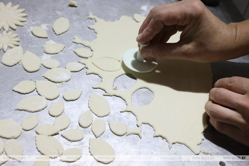 Каждый из выпеченных румяных красавцев не похож на собрата. У всех свой декор, сделанный вручную из соленого теста. Вес караваев начинается от 2 кг. С пылу с жару их разбирают накануне областных "Дажынак", и сегодня к вечеру все отправятся к заказчикам. В числе караваев появятся пять двухъярусных и одна трехъярусная модель. Среди свежеиспеченной "коллекции" сразу бросаются в глаза на золотистой корочке вишневые украшения - бренд Глубокского района. Кстати, пироги с этой ягодой хлебозавод тоже представит на ярмарке тружеников села завтра.
