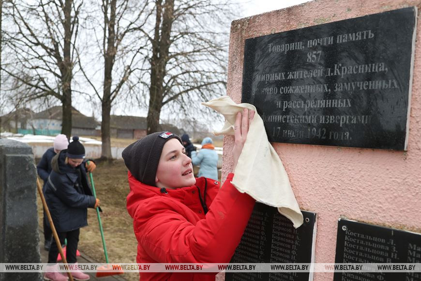 18 марта, Могилев /Корр. БЕЛТА/. Молодежь и активные жители Быховского района присоединились к акции по наведению порядка возле памятных знаков сожженным деревням. Сегодня занимались благоустройством у мемориального комплекса в деревне Красница. Об этом корреспонденту БЕЛТА сообщила начальник отдела идеологической работы, культуры и по делам молодежи Быховского райисполкома Тамара Семенова.