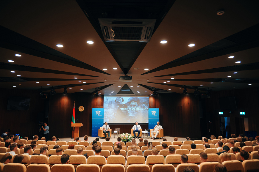 Во время встречи прошел и открытый диалог с молодежью. На вопросы ребят отвечали заместитель прокурора Минска Сергей Куратник и председатель Минского городского совета ветеранов Филипп Высоцкий.