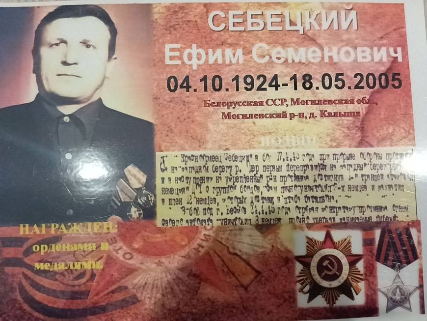В числе самых ценных наград ветерана был орден Славы третьей степени. В наградном листе указано, что он получил его после событий 17 апреля 1945 года при прорыве обороны противника на западном берегу реки Одер. Ефим Семенович один переправился на другой берег, добрался до укрепленного района неприятеля и атаковал немецкий дот с группой бойцов. Красноармеец лично уничтожил трех противников и захватил в плен 12 немцев, которых доставил в штаб батальона. Еще один подвиг он совершил в бою в восточной Германии 24 апреля этого года, отражая контрнаступление. Он уничтожил восьмерых немцев, прочно удержав занимаемый рубеж, хоть и был на тот момент ранен.Мужчины в роду Себецких очень похожи по характеру на своего героического родственника: смелые и целеустремленные, с обостренным чувством справедливости. "Дедушку характеризует даже тот факт, что он приписал себе два года, чтобы пойти на фронт, - вспоминает Андрей Себецкий. - Решительный и бесстрашный юноша не смог сидеть в тылу и бездействовать: родной земле нужны были защитники - и он без раздумий встал в их ряды".