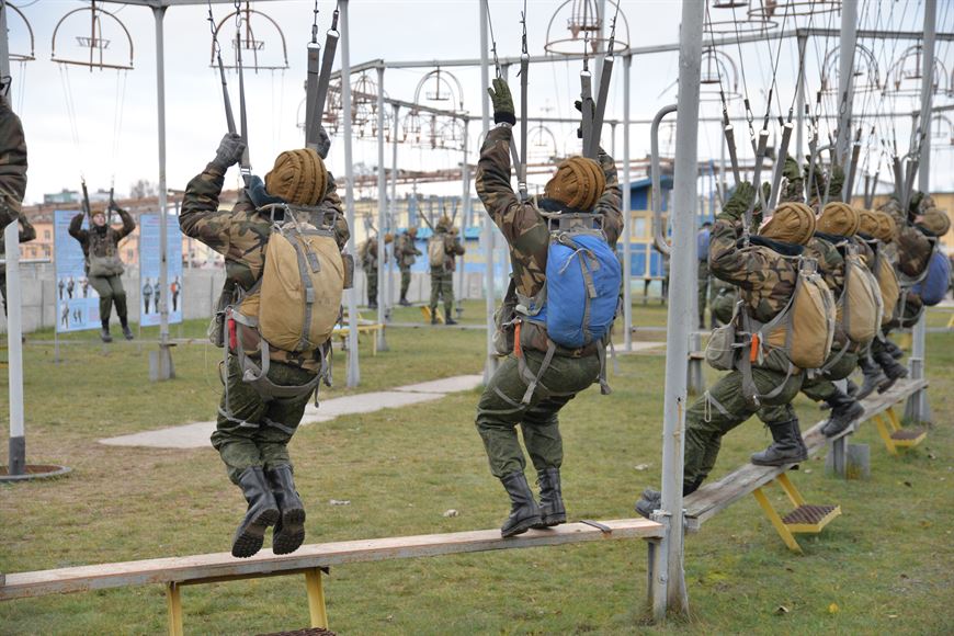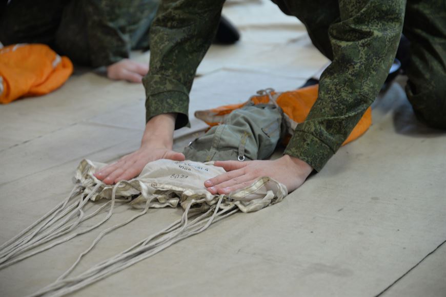 Пока одни новобранцы учатся правильно укладывать парашют, их сослуживцы тренируются на воздушно-десантном комплексе. Молодые люди каждый элемент прыжка с парашютом отрабатывают по отдельности. Прежде чем совершить реальный прыжок, все действия доводятся до автоматизма.