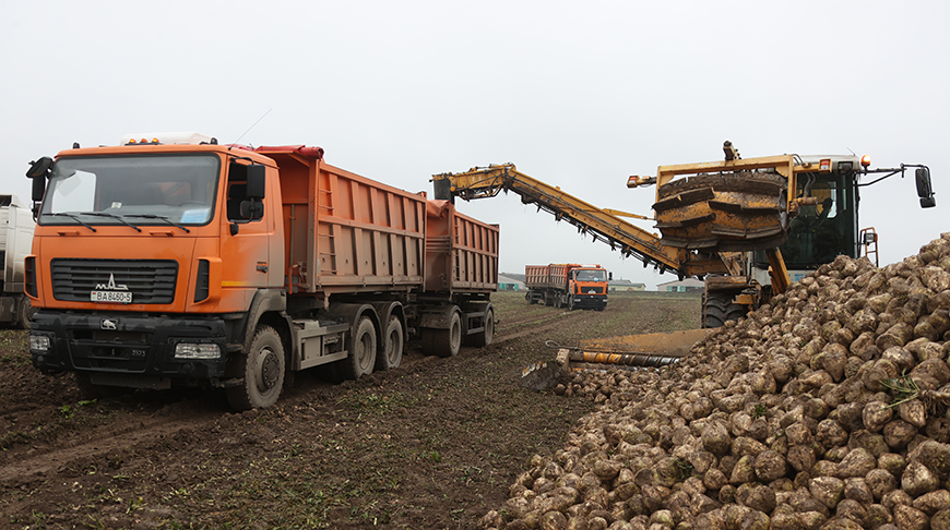Бурт постепенно перетекает по ленте погрузочного комбайна в кузова выстроившихся в ряд автосамосвалов. Как только мы подъехали, одна из машин, заполненная доверху корнеплодами, отправилась в сторону Слуцкого сахарорафинадного комбината. Прибыв на место, подходим к главному агроному ОАО "Подлесье-2003" Николаю Кононку.