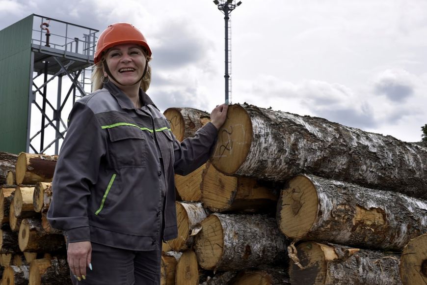 Контролер деревообрабатывающего производства Оксана Постная показывает рукой на недавно отгруженную партию леса и комментирует: