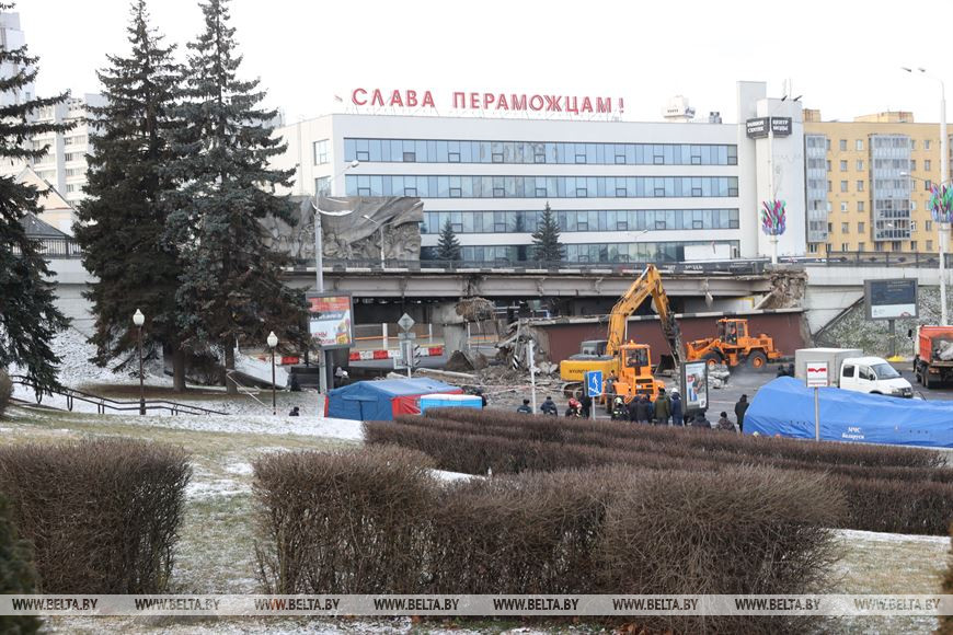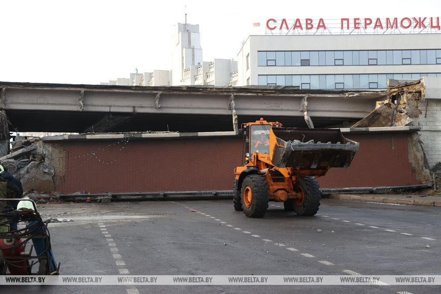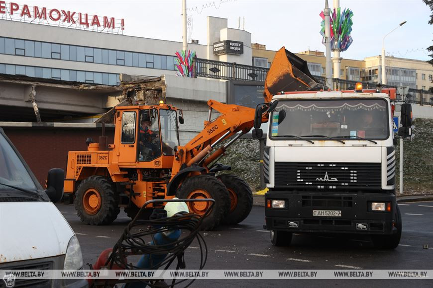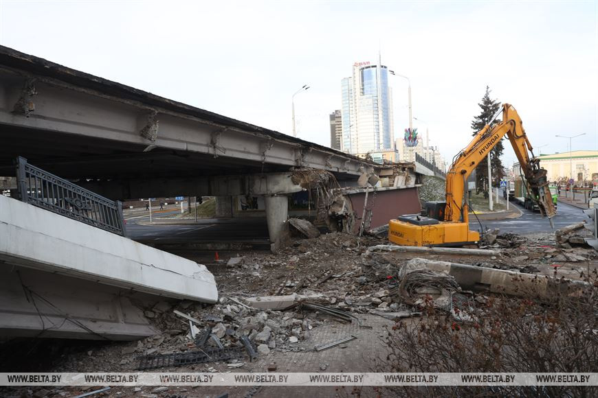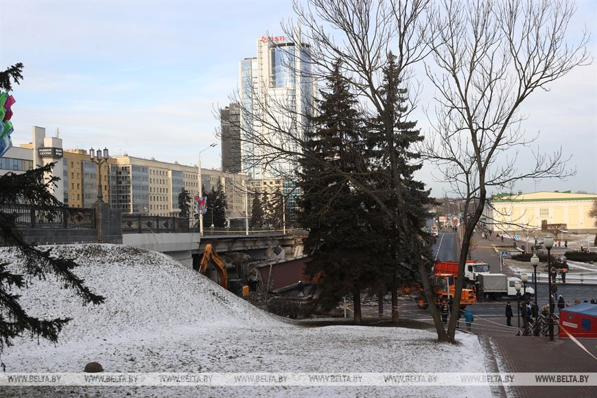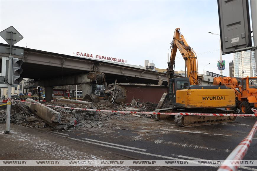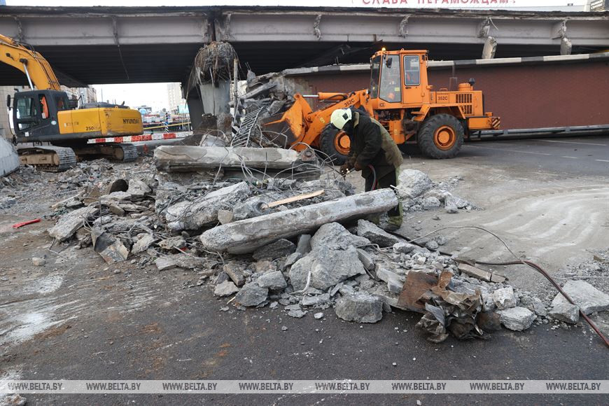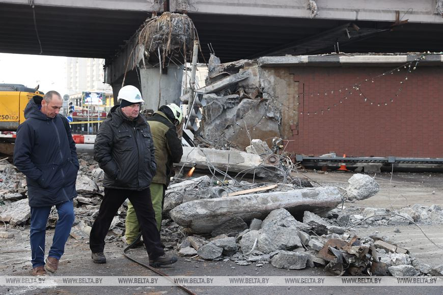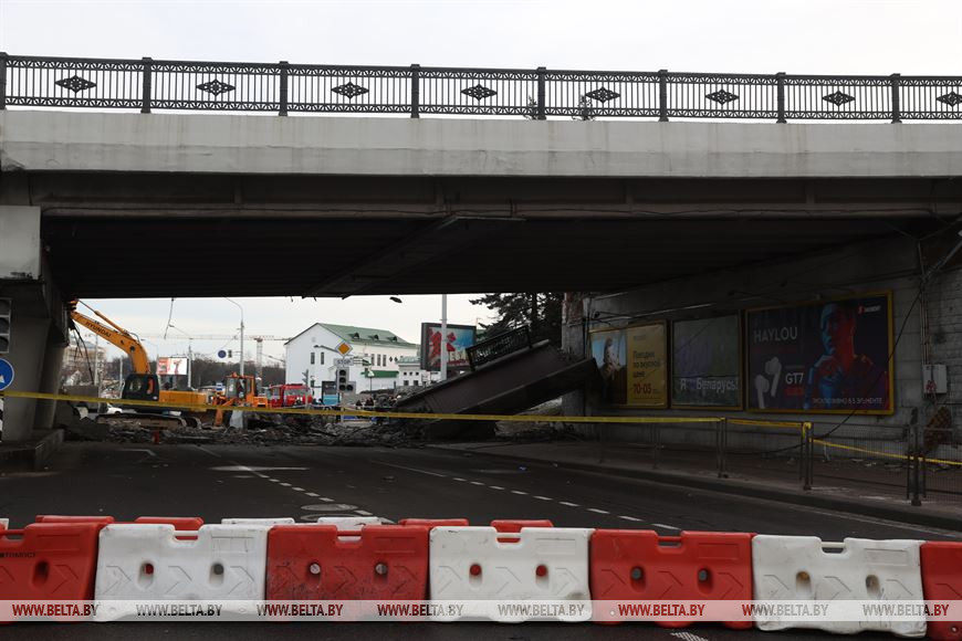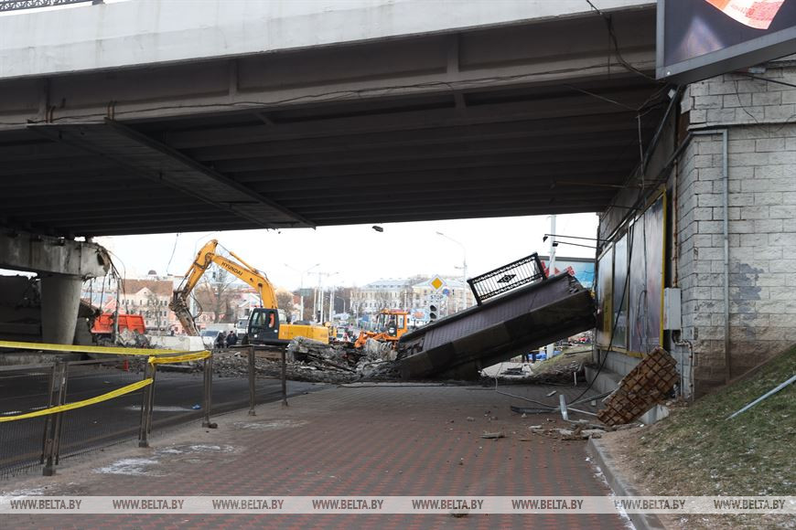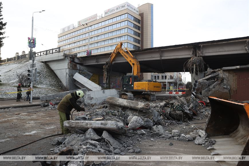 Работы на путепроводе через ул.Немига будут вестись круглосуточно. "Наша задача - в течение дня завершить демонтаж обрушившихся конструкций. За неделю - разобрать весь путепровод. Строительство нового будет начато оперативно, но работы займут несколько месяцев. Они будут вестись круглосуточно", - добавил Александр Дорохович.